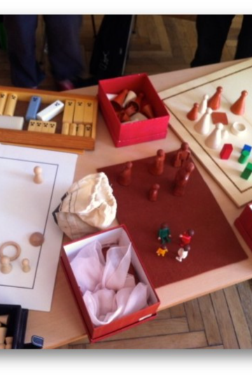 Es handelt sich dabei um eine Stellfläche mit einem Satz Figuren unterschiedlicher Größe und Farbe, die es dem Klienten/der Klientin ermöglichen, die Mitglieder eines Systems (Familie, Team, Abteilung, etc.) auf- bzw. darzustellen.